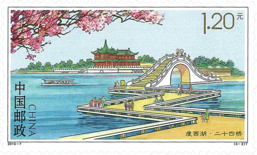 《瘦西湖》邮票采用了新中国第一代邮票设计家孙传哲生前的创作作品,以工笔勾线的画法,展现了五亭桥、白塔、二十四桥等标志性景点,画面精巧别致,意境广阔。