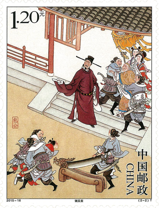 邮票上的两则故事脍炙人口,充分反映了包公清正廉洁、秉公执法的作风。《掷端砚》讲的是包公乘船离任端州(今广东肇庆)途中,突遇狂风巨浪。包公感到蹊跷,检查行囊,发现有人私自收下砚工送的一方端砚。包公坚辞不受,抛入江中,这才风平浪静。后来在包公掷砚处形成“砚洲岛”。包砚的黄布顺流而下,形成“黄布沙”。《铡美案》讲书生陈世美考中状元后,隐瞒家有妻室的实情,当上驸马爷。其妻秦香莲带孩子进京寻夫,不料陈世美欲杀妻灭子。秦香莲遂状告到开封府。包公不畏权贵,把忘恩负义的陈世美判刑斩首。
