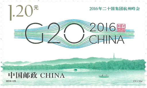 二十国集团(G20)由七国集团财长会议于1999年倡议成立,由阿根廷、澳大利亚、巴西、加拿大、中国、法国、德国、印度、印度尼西亚、意大利、日本、韩国、墨西哥、俄罗斯、沙特阿拉伯、南非、土耳其、英国、美国以及欧盟20方组成。2016年二十国集团杭州峰会是二十国集团领导人之间的第11次高峰会,于9月4日至5日在中国浙江省杭州举行。这是中国第一次举办二十国峰会,也是继韩国举办2010年二十国集团首尔峰会之后第二次在亚洲举办这项峰会,习近平主席主持峰会欢迎仪式、开幕式、五个阶段会议、闭幕式等活动。峰会主题为“构建创新、活力、联动、包容的世界经济”,并在此之下设定了“创新增长方式”、“更高效的全球经济金融治理”、“强劲的国际贸易和投资”、“包容和联动式发展”四项重点议题。2016年二十国集团杭州峰会会徽会标图案用20根线条,描绘出一个桥形轮廓,同时辅以G202016CHINA和篆刻隶书“中国”印章。邮票图由会标和西湖景色构成,色调清新淡雅。