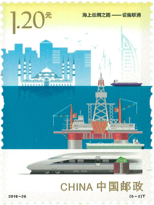 海上丝绸之路是指中国与世界其他地区进行经济文化交流、交往的海上通道。在唐、宋、元的繁盛期,中国境内主要由泉州、广州、宁波三个主港和其他支线港组成,为联合国教科文组织唯一认定的海上丝绸之路起点。丝绸之路不是具体的一条路,而是后世对中国与西亚、中亚、西方所有来往通道的统称。在唐中期前,对外主通道是陆上丝绸之路,之后由于战乱及经济重心转移等原因,海上丝绸之路取代了陆路成为中外贸易交流主通道,在宋元时期是范围覆盖大半个地球的人类历史活动和东西方文化经济交流的重要载体。2013年9月和10月,中国国家主席习近平在出访中亚和东南亚国家期间,先后提出共建“丝绸之路经济带”和“21世纪海上丝绸之路”的重大倡议。这一构思以“政策沟通、设施联通、贸易畅通、资金融通、民心相通、海上交通”为主要内容,为沿线各国经济社会共同发展创造更加美好的明天。“21世纪海上丝绸之路”建设不仅延续古代海上丝绸之路曾经繁荣的海上合作,还赋予其新的时代内涵,使之成为促进共同发展、实现共同繁荣的合作共赢之路,增进理解信任、加强全方位交流的和平友谊之路。邮票背景将海上丝绸之路沿线的知名历史古迹与现代地标建筑及示意性的城市建筑群相结合,由古至今,反映出海上丝绸之路的地理范围和其绵延不绝的悠久历史与欣欣向荣的时代风貌。