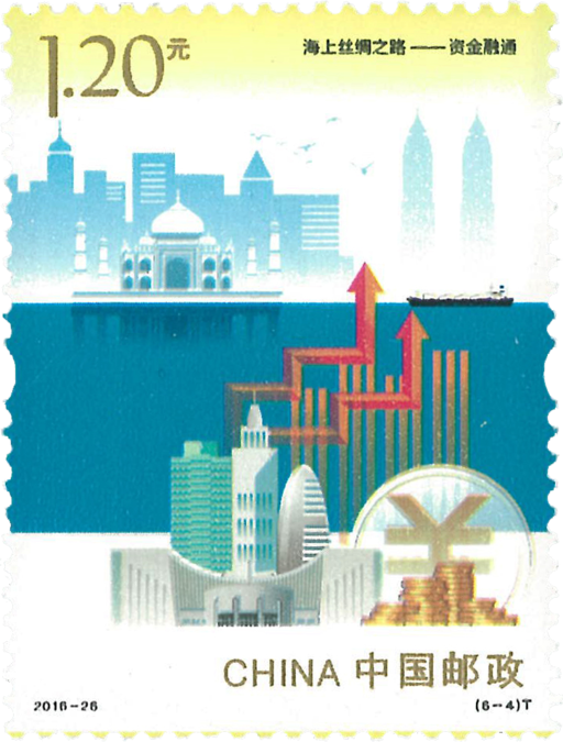 海上丝绸之路是指中国与世界其他地区进行经济文化交流、交往的海上通道。在唐、宋、元的繁盛期,中国境内主要由泉州、广州、宁波三个主港和其他支线港组成,为联合国教科文组织唯一认定的海上丝绸之路起点。丝绸之路不是具体的一条路,而是后世对中国与西亚、中亚、西方所有来往通道的统称。在唐中期前,对外主通道是陆上丝绸之路,之后由于战乱及经济重心转移等原因,海上丝绸之路取代了陆路成为中外贸易交流主通道,在宋元时期是范围覆盖大半个地球的人类历史活动和东西方文化经济交流的重要载体。2013年9月和10月,中国国家主席习近平在出访中亚和东南亚国家期间,先后提出共建“丝绸之路经济带”和“21世纪海上丝绸之路”的重大倡议。这一构思以“政策沟通、设施联通、贸易畅通、资金融通、民心相通、海上交通”为主要内容,为沿线各国经济社会共同发展创造更加美好的明天。“21世纪海上丝绸之路”建设不仅延续古代海上丝绸之路曾经繁荣的海上合作,还赋予其新的时代内涵,使之成为促进共同发展、实现共同繁荣的合作共赢之路,增进理解信任、加强全方位交流的和平友谊之路。邮票背景将海上丝绸之路沿线的知名历史古迹与现代地标建筑及示意性的城市建筑群相结合,由古至今,反映出海上丝绸之路的地理范围和其绵延不绝的悠久历史与欣欣向荣的时代风貌。