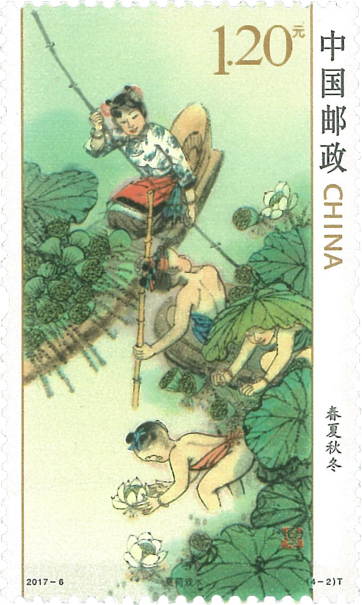 地球在围绕太阳不停地公转的同时,也在绕自身的地轴自转,不过地轴并不垂直于公转轨道面,而是有一个66.5度的倾角。正因为这个倾角的存在,才会使太阳在地球表面的直射点在南、北回归线之间移动,从而形成了春夏秋冬,又称为“四季”。春天始于二十四节气中的“立春”,夏天始于“立夏”,秋天始于“立秋”,冬天则始于“立冬”。四季的概念在黄河流域最为确切,我国劳动人民总结的基本规律是春生、夏长、秋收、冬藏。正是《黄帝内经》等国学典籍所阐述的人与自然关系的基本思想。春夏秋冬四季在中国人眼里不仅是季节的分界,更是人与自然的和谐相处。邮票内容分别为:春燕剪柳、夏荷戏水、秋鸡鸣穗、冬雪映梅。“春”来微风和煦、两岸柳扬,一群幼童在放风筝;“夏”时孩子们摇着小船穿梭在荷花荡,有的顶着荷叶帽,有的摆弄着手中莲花;“秋”日云高万里,遍布金黄色调。孩童们忙着收稻谷;“冬”有飘漫天、梅红绽放,女儿家在忙着贴福字、孩童们蹲在地上放鞭炮,给新年讨个好彩头,一派喜气祥和的景象。