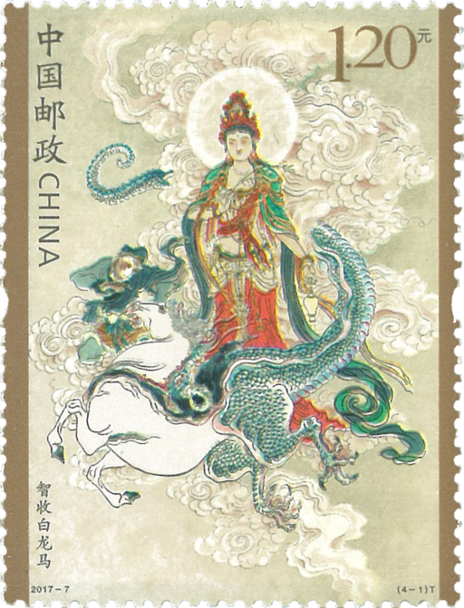 《西游记》是中国四大古典文学名著之一,作者吴承恩(1500-1582),出生于淮安府山阳县(今江苏淮安市淮安区河下古镇)。现其家乡建有吴承恩故居和墓园。2015年发行的《中国古典文学名著一<西游记>(一)》开启了“西游记”系列邮票的大幕。2017年发行的第二组选自第十五回到第二十四回的内容,由著名艺术家李云中精心创作,表现了智收白龙马、猪八戒拜师、流沙河收沙僧和偷吃人参果四个故事。智收白龙马:取自第十五回“蛇盘山诸神暗佑鹰愁涧意马收缰”。白龙马,本是西海龙王三太子,因纵火烧毁玉帝赏赐的明珠,触犯天条,犯下死罪,幸亏观音菩萨出面才免于死罪,被贬到蛇盘山鹰愁涧。当行者服侍唐僧路过此地,突然钻出一条龙来,将唐僧所骑白马一口吞下。这时观音菩萨差来一路神祗,将此龙点化,锯角退鳞,变身为白龙马,皈依佛门。取经路上供唐僧坐骑,任劳任怨,历尽艰辛,终于修成正果。猪八戒拜师:取自第十九回“云栈洞悟空收八戒浮屠山玄奘受心经”。悟空在高老庄降妖,妖怪逃回福陵山云栈洞的老巢,入洞取出九齿钉耙和悟空大战,战败后问悟空为何多管闲事,悟空自报在保护唐僧取经,妖怪忙丢下钉耙,跟悟空去拜见唐僧。原来这妖怪原是上界天蓬元帅,因调戏嫦娥被贬下凡,在云栈洞为妖,后被观音点化,取名猪悟能,在此等候,保护唐僧西天取经。唐僧大喜,因和尚不得食用五常三厌给他取名猪八戒,收他做了二徒弟。流沙河收沙僧:取自第二十二回“八戒大战流沙河木叉奉法收悟净”。师徒三人来到流沙河,河中跳出一个妖怪,要抢唐僧。八戒三战妖怪,妖怪却钻入水中,隐迹潜踪,渺然不见。于是悟空前往南海请观音收服。观音说明此妖怪是卷帘大将,失手打碎琉璃盏,被贬下界,派遣木叉与悟空来收服。沙僧奉木叉命令,取下自己项下由九个骷髅头连接而成的项链,将葫芦安放在中间,结成一只法船,木叉护送唐僧过河,师徒四人辞别木叉继续西行。偷吃人参果:取自第二十四回“万寿庄大仙留故友五庄观行者窃人参”。师徒四人来到五庄观住下。这里有树结人参果,吃后长生不老。观主有事离开,命二童子将人参果给唐僧吃,好好招待。唐僧误认为人参果为婴儿而未敢食,二童子便吃了,被悟空三人发现,勾起了馋虫。悟空偷果三个,与八戒、沙僧分食。二童子大骂唐僧,悟空难忍,将树弄倒。后孙悟空请来南海观世音菩萨,用神水把人参果树救活后,继续西行取经。