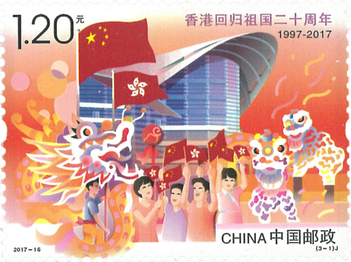 龙腾香江以象征喜庆的红、橙色调为主,表现了香港会展中心前飘扬的国旗区旗和香港各界群众的欢庆场面。寓意血脉相连,象征香港繁荣昌盛。