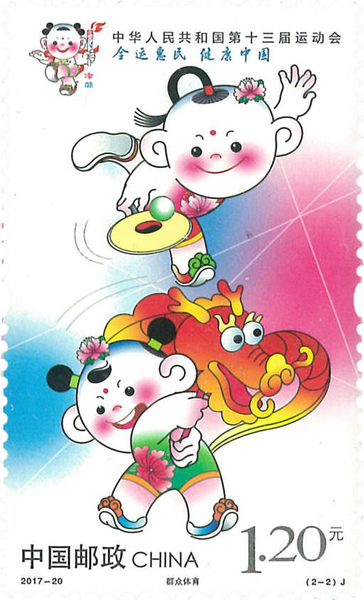 中国邮政特发行纪念邮票1套2枚,小全张1枚。邮票画面展现了以吉祥物“津娃”为主要形象的运动项目:;二图表现了群众比赛中的舞龙、柔力球两项运动。
