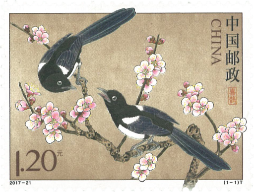喜鹊流行的吉祥寓意图案,有“喜鹊登枝头”、“喜上眉梢”、“喜在眼前”等常见的形式,“喜鹊登梅”亦是中国画中常见的题材,喜鹊还经常出现在中国传统诗歌、对联中。民间将喜鹊作为吉祥、爱情的象征,有很多好听的神话传说。传说喜鹊能报喜,画鹊兆喜的风俗大为流行,品种也有多样:如两只鹊儿面对面叫“喜相逢”,双鹊中加一枚古钱叫“喜在眼前”,鹊登梅枝报喜图,又叫“喜上眉梢”。