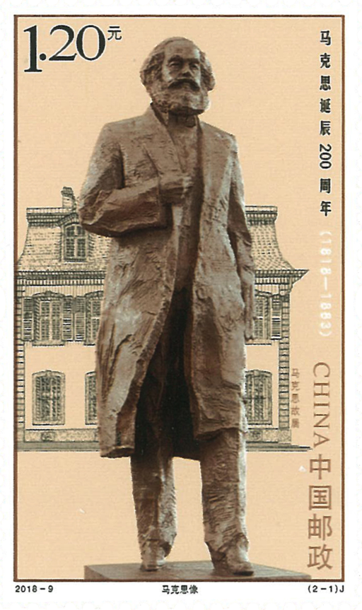 此套邮票设计者为中国美术馆馆长、中国美术家协会副主席吴为山,作为中国著名雕塑家,其雕塑代表作有《孔子》《孔子问道于老子》《齐白石与达·芬奇对话》等。邮票选取了吴为山先生的经典雕塑作品,第一图为马克思像,背景为马克思位于德国特里尔市的故居。第二图为马克思与恩格斯像,背景为《共产党宣言》德文版、中文版以及《资本论》中文版等马克思主义经典著作。