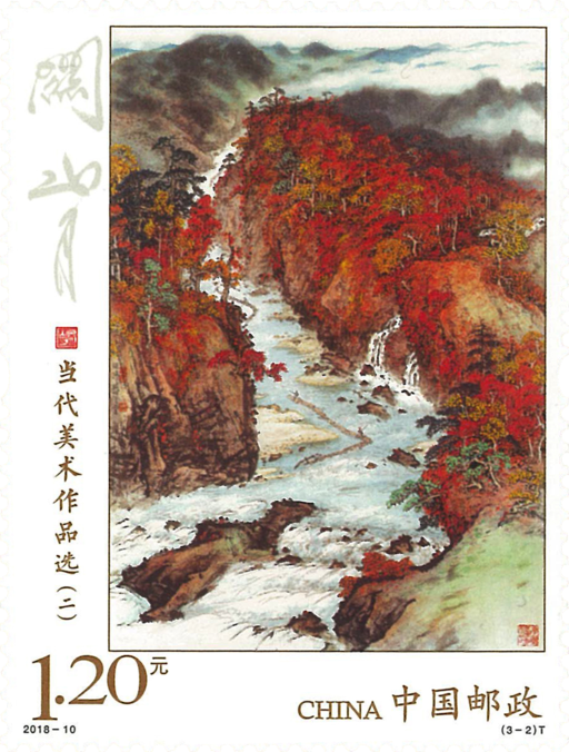 《秋溪放筏》,关山月(1912-2000)作,1983年。该幅作品注重浓墨重彩的艺术表现力,作者在肆意渲染色彩的同时,又极为细致地勾勒出各种景物,给人一种粗中有细的视觉冲击感。作品采用了传统重彩的方法,与西洋画的用色观念相融合。画面气势雄健,色彩瑰丽,表现了祖国大好河山的壮丽与秀美。