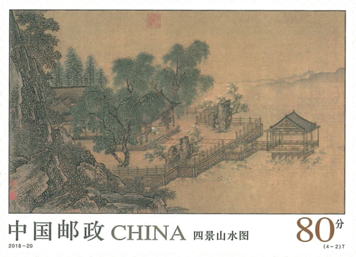 《四景山水图》卷,绢本,设色,纵40厘米,横69厘米。藏于故宫博物院。作者刘松年,南宋宫廷画院画家,“南宋四大家”之一。《四景山水图》邮票一套四枚,选取了南宋宫廷画家刘松年所作《四景山水图》卷中的四段,描绘了南宋都城临安(今浙江杭州)的庭院别墅,表现了此时期山湖楼阁中士大夫的闲逸生活。