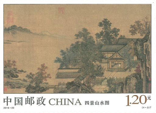 《四景山水图》卷,绢本,设色,纵40厘米,横69厘米。藏于故宫博物院。作者刘松年,南宋宫廷画院画家,“南宋四大家”之一。《四景山水图》邮票一套四枚,选取了南宋宫廷画家刘松年所作《四景山水图》卷中的四段,描绘了南宋都城临安(今浙江杭州)的庭院别墅,表现了此时期山湖楼阁中士大夫的闲逸生活。