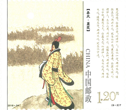 邮票分别从风、雅、颂三类中选取了《周南·关雎》《秦风·蒹葭》《秦风·无衣》《小雅·鹿鸣》《小雅·鹤鸣》《鲁颂·马马冋》六个代表性的篇目。这些优秀篇目反映出《诗经》描写生动,语言朴素优美,声调自然和谐,富有艺术感染力的特点。邮票设计典雅厚重,画面充分体现出相应诗篇的意境。