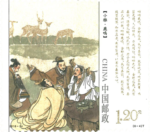 邮票分别从风、雅、颂三类中选取了《周南·关雎》《秦风·蒹葭》《秦风·无衣》《小雅·鹿鸣》《小雅·鹤鸣》《鲁颂·马马冋》六个代表性的篇目。这些优秀篇目反映出《诗经》描写生动,语言朴素优美,声调自然和谐,富有艺术感染力的特点。邮票设计典雅厚重,画面充分体现出相应诗篇的意境。