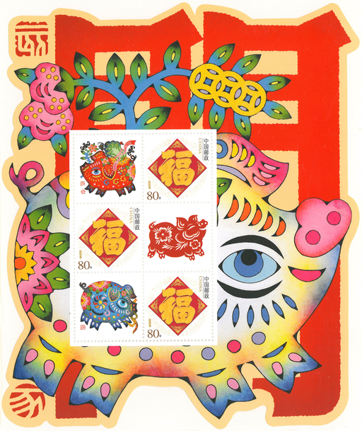 中华文化博大精深。观览这博大精深,十二生肖敞开一个视野广阔的小窗口。《己亥年》邮票来了,新春的吉祥物已然众望所归—亥年属相猪,这憨态可掬、富态可爱的值岁官,正行囊满满而来,带着畜牧史的悠远时光,也驮来充盈古今文化的聚宝盆。于是,人们猪年说猪,说生肖,说文化,说五谷丰登、六畜兴旺,更要说一说“猪年是肥年”,说一说“肥猪拱门”,“猪入门,百福臻”一一虽是传统贺岁语,却也电视微信网上,窗花吊钱春联,展现与当今大众生活的融合,接着地气。只道是:老话新意一一幸福美满好日子,新春新期待。
