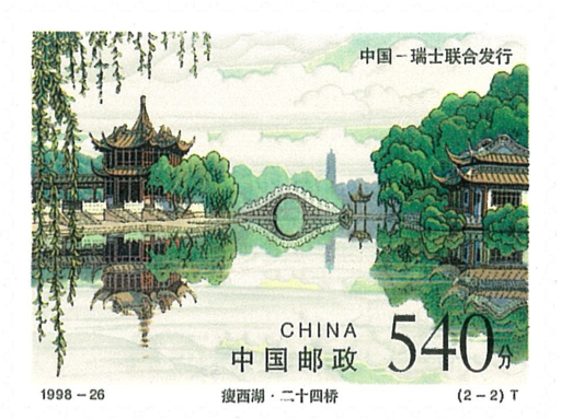 中国的瘦西湖与瑞士的莱芒湖均为世界著名风景区和旅游胜地。瘦西湖,位于江苏扬州,具有中国江南秀美的风光,因其湖身狭长,景色可与杭州西湖媲美,故得此名。此套邮票为中瑞两国联合发行。