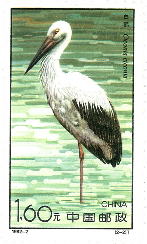 在这2枚邮票的图案设计中,作者刻意追求一种对称美,收到了良好的艺术效果。从鹳种看,一只黑鹳,一只白鹳,刚好黑、白对称;在衬底的着色上,一枚偏棕黄,一枚偏灰绿,形成明暗、冷暖对比;在构图上,黑鹳双腿着地,悠然自得,慢踱方步,羽毛整洁,而白鹳单腿伫立,垂首略作小憩,羽毛未及梳理,仿佛刚从湖中嬉水而出,两鹳动、静姿态对称;若把2枚邮票排列一起,则一鹳朝东,一鹳朝西,相互呼应。在国名、票名、面值等文字的布局上,2枚邮票也是相互对应、平稳得体。