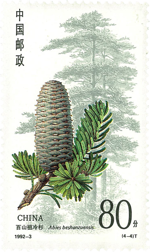 秃杉,为常绿大乔木,杉科台湾杉属。秃杉最高可达75米,叶为四棱状钻形,长2-5毫米,排列紧密。球果呈圆柱形或长椭圆形,种鳞21-39个。30年代末,法国裸子植物专家Gaussen根据采自我国云南贡山的标本而最早发表。秃杉成材快,且材质优良,已被列为速生造林树种。 百山祖冷杉,为常绿乔木,松科冷杉属。百山祖冷杉高11米;叶子呈 条形,长1.5-3.5厘米;球果呈圆柱形,长7-12厘米。70年代 ,由长期在林业第一线从事科研工作的高级工程师吴鸣翔首次发现。这一新 冷杉的发现,填补了我国华东地区无冷杉属植物分布的空白,对研究古气候 及第四纪冰期具有重要意义。由于这种新冷杉仅在浙江南部庆元县百山祖 南坡海拔1700米地带的针阔混交林中保存4株,并且难于开花结果,因 而已被列为世界亟待保护的濒危植物。 我国过去发行的植物邮票,除《食用菌》外,都是被子植物邮票,以表 现花冠为主。这套《杉树》邮票另辟蹊径,以表现球果为主。杉树的主要特 征部位是球果(即花序呈球形或圆锥形,由许多覆瓦状的木质鳞片组成,长 成后很象果实),这是裸子植物的共同特点。设计者选择成熟后期的球果枝 ,将其置于画面的主要部位,尽量准确地刻画球果的形状和种鳞的数量及排 列方式。在色彩上,成熟果多呈赭褐色,与绿色叶片形成比较醒目的对比, 使画面避免过于单调。在这套邮票上,球果枝不仅位置突出,而且画得很实 、很具体,它们构成了每一个画面的主体。在主体的后面,作者描绘了杉树 的整体形态。树形作为远景,是近景的必要补充和有机组成部分。作者采用 青灰色来画树,不仅使画面层次分明,而且使4枚邮票在色调上比较统一。 整套邮票具有一种素雅宁静的气氛。
