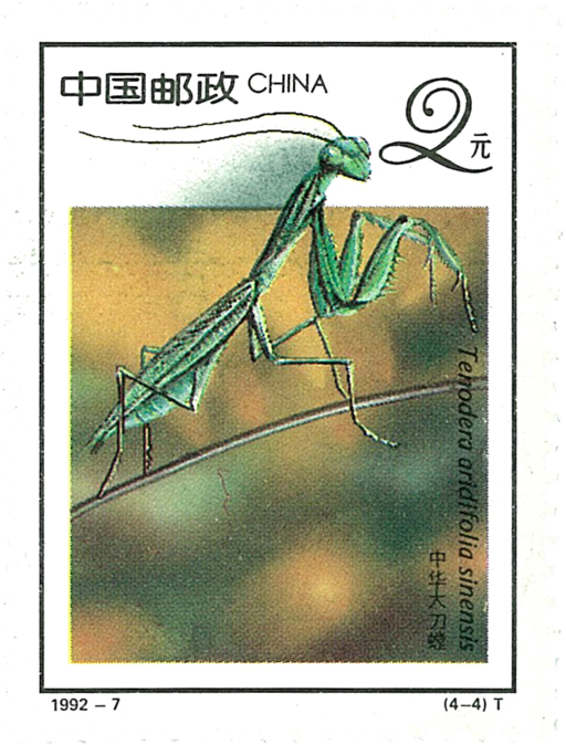 设计者使七星瓢、半黄赤蜻、大草蛉、中华大刀螳这四种益虫,在4枚邮票 画面上形成了不同方向、不同结构的大斜线。这一构图布局增加了“向上”的动感,赋予昆虫以生命的活力。设计者巧妙地以一个长方形的绿色背景为底衬,又以昆虫打破了画面上方的水平线,使大斜线与水平线、垂直线互为交织,使人感到昆虫有欲冲出画面之势。其绿色背景不是一块静止的平面,而是采取喷绘手法求得柔和变幻的流动感,使四种不同的黄绿色表现出不同植物的生命力。画面背景并未加以很具体的描绘,反而给人们留下对自然生态环境的联想余地。