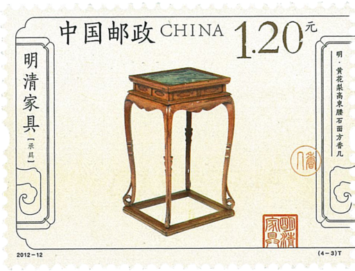 邮票上的承具分别为:明代黄花梨高束腰石面方香几。此香几是传统的形制,设计巧妙,造型优美。
