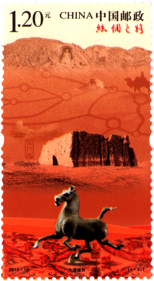 第二枚邮票表现的是玉门关和铜奔马。玉门关,位于甘肃敦煌西北。铜奔马,出土于甘肃武威,是丝绸之路上的珍贵文物。