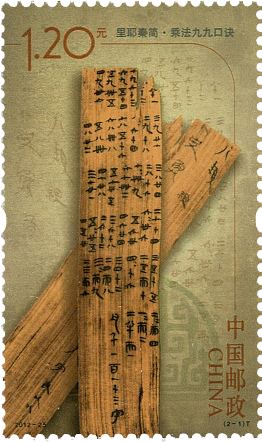 《里耶秦简》特种邮票一套两枚,邮票图名分别为:乘法九九口诀、秦历日。九九乘法口诀出土编号为第六层第一号。木牍长23厘米,宽4.5厘米,双面均有文字。九九乘法口诀分为六栏,每一栏从右向左竖行书写,排列很有规律。这枚简牍给算术史的研究提供了珍贵的实物资料,是我国最早的乘法口诀实物。