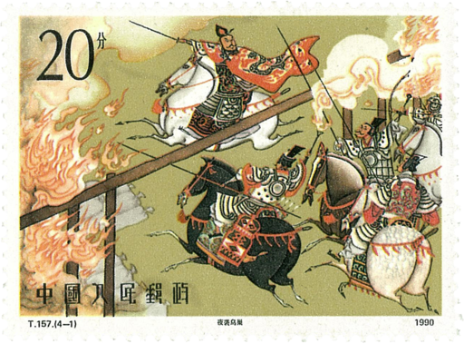 [夜袭乌巢]取自《三国演义》第三十回“战官渡本初败绩劫乌巢孟德烧粮”。曹操与袁绍对峙于官渡。袁绍听信奸臣加害谋士许攸,许攸遂投奔曹操并献计。曹操率兵五千,持袁军旗号进军。纵火烧毁袁军粮草重地鸟巢,袁绍被迫败退冀州。