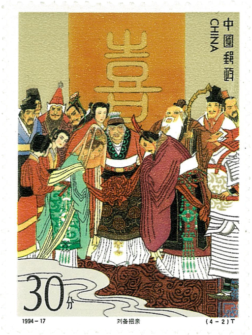 [刘备招亲]取自《三国演义》第五十四回“吴国太佛寺看新郎刘皇叔洞房续佳偶”。甘夫人新丧,东吴派鲁肃向刘备讨还荆州,被拒绝。周瑜建议孙权假意将孙权其妹许嫁刘备,趁机将刘备囚禁,以换回荆州。诸葛亮将计就计,派赵云护送刘备去东吴结亲,并面授三条锦囊妙计,使美人计败露。刘备取得吴国太的好感,与孙夫人喜结良缘,而且顺利地返回,东吴陪了夫人又折兵。