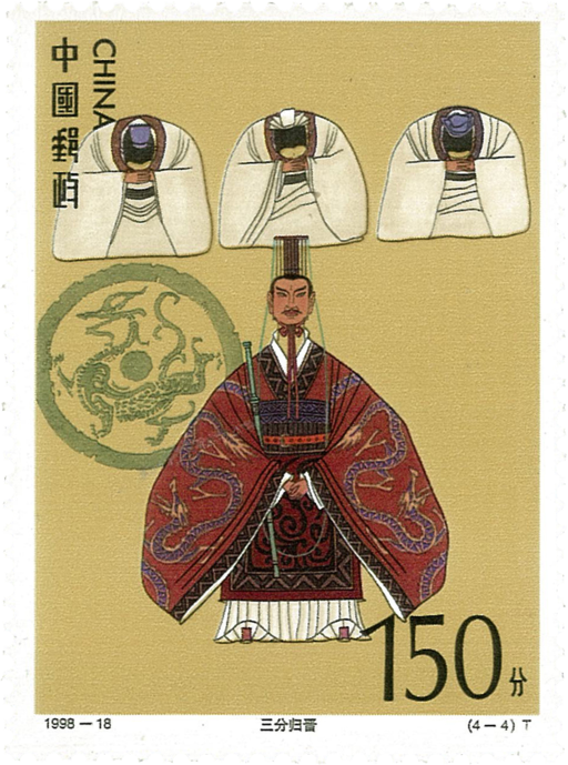 [三分归晋]取自《三国演义》第一百二十回“荐杜预老将献新谋降孙皓三分归一统”。司马昭派兵大举进攻汉中,姜维主张派兵抵抗,无奈刘禅不听,终日饮酒作乐。公元263年,蜀国被魏军攻破,刘禅被俘。公元265年,司马炎称帝,建立了晋朝。此时,新吴主孙皓继位为帝,司马炎派杜预率兵伐吴,晋军水陆并进,大胜。三国分立至此结束,正所谓“天下大势,合久必分,分久必合”。