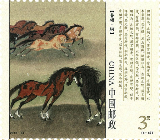駉駉牡马,在坰之野。薄言駉者,有驈有皇,有骊有黄,以车彭彭。思无疆,思马斯臧。 駉駉牡马,在坰之野。薄言駉者,有骓有駓,有骍有骐,以车伾伾。思无期,思马斯才。 駉駉牡马,在坰之野。薄言駉者,有驒有骆,有駵有雒,以车绎绎。思无斁,思马斯作。 駉駉牡马,在坰之野。薄言駉者,有骃有騢,有驔有鱼,以车祛祛。思无邪,思马斯徂。