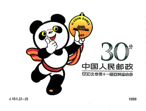 “亚运会吉祥物”。画面主图是北京第十一届亚运会的吉祥物——手拿亚运会奖章、笑容可掬的大熊猫。大熊猫不仅是中国的国宝,也是世界各国人民所喜爱的珍贵动物。吉祥物的名字称为“盼盼”,即盼望和平、友谊和好成绩。