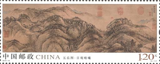 邮票设计完整展现了《五岳图》图卷的原貌,颜色古朴厚重,设计简洁大气,整体风格清新雅致。邮票印制采用胶雕套印工艺,雕刻师运用生动遒劲的刀法,熟练的点、线语言,表现出画面浓淡相间、虚实对比的深远意境。