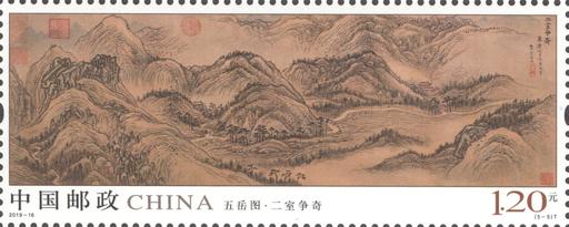 邮票设计完整展现了《五岳图》图卷的原貌,颜色古朴厚重,设计简洁大气,整体风格清新雅致。邮票印制采用胶雕套印工艺,雕刻师运用生动遒劲的刀法,熟练的点、线语言,表现出画面浓淡相间、虚实对比的深远意境。