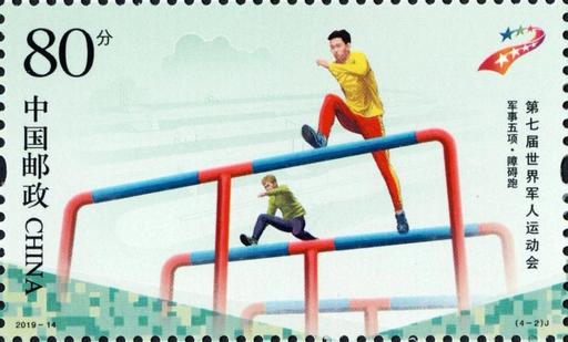 邮票第一图田径·标枪,为田径运动传统项目,画面背景为军运会开幕式场馆——武汉体育中心。邮票第二图到第四图均为军运会特色项目。第二图军事五项·障碍跑,画面背景为军事五项比赛场地;第三图海军五项·航海技术,画面背景为海军五项比赛场地;第四图跳伞·四人造型,画面背景为武汉长江大桥和黄鹤楼。四枚邮票右上图案为本届军运会的会徽——和平友谊纽带。