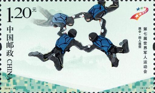 邮票设计选取四个运动项目的典型画面,风格统一又富于变化,通过对运动员动态细致的刻画,准确描绘出四个项目的特征。邮票印制使用了特种油墨,营造出的迷彩氛围,更增加了军运会特色和律动感。