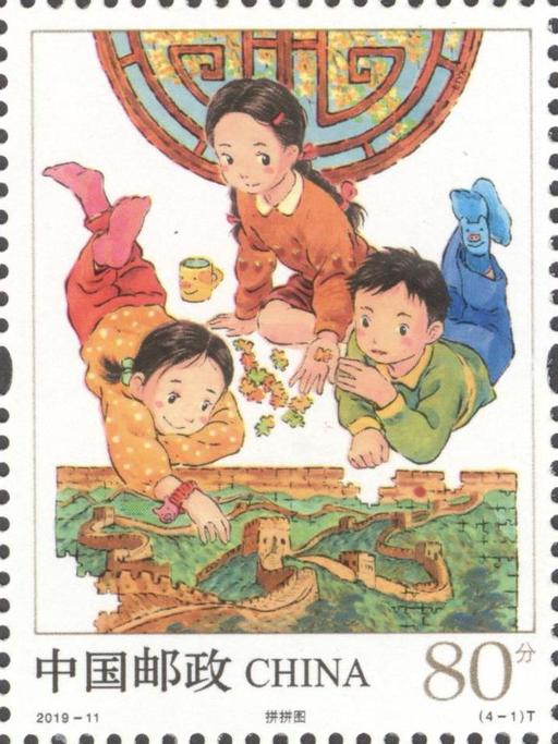 本套邮票描绘了拼拼图、堆沙堡、滑轮滑、搭积木四种广受现代儿童喜爱的游戏,两种益智类、两种体育类,其中第一图的拼长城内容呼应了庆祝新中国成立70周年的概念。
