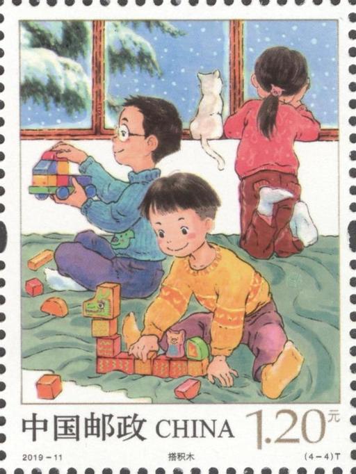 本套邮票描绘了拼拼图、堆沙堡、滑轮滑、搭积木四种广受现代儿童喜爱的游戏,两种益智类、两种体育类,其中第一图的拼长城内容呼应了庆祝新中国成立70周年的概念。
