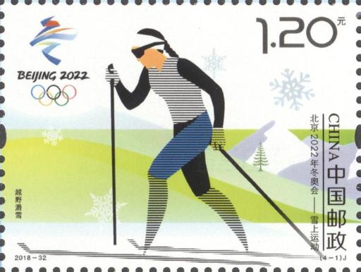 中国邮政定于2018年11月16日发行《北京2022年冬奥会——雪上运动》纪念邮票1套4枚,邮票图案名称分别为:越野滑雪、高山滑雪、冬季两项、自由式滑雪,全套邮票面值为4.80元。