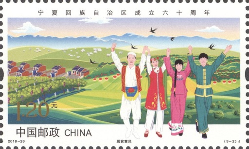 该套邮票采用手绘手法,全景表现了宁夏回族自治区成立六十年的崭新面貌。第一图以高端数控机床制造等为代表的高科技产业,以飞艇制造为代表的军民融合产业,以宁东能源化工基地、风力发电等为代表的能源产业,表现了宁夏深入实施创新驱动发展战略的崭新形象。第二图以闽宁镇原隆村民居为原型,表现宁夏实施的易地扶贫搬迁生态移民工程;宁夏特有的硒砂瓜、枸杞、滩羊等表现了自治区通过特色产业精准扶贫,整体展现了宁夏各族人民安居乐业同庆节日的喜悦和团结携手共建美好家园的信心。第三图以象征宁夏人民坚毅、勇敢品质的马兰花和银川城市一隅为前景,结合自治区生态命脉的贺兰山、六盘山、黄河以及湿地等元素,描绘了一幅“塞上江南”的山水图画,呈现了宁夏坚持生态立区的美好前景。