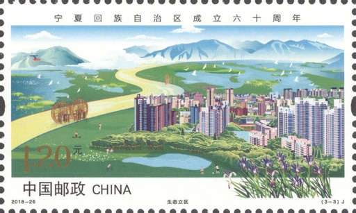 该套邮票采用手绘手法,全景表现了宁夏回族自治区成立六十年的崭新面貌。第一图以高端数控机床制造等为代表的高科技产业,以飞艇制造为代表的军民融合产业,以宁东能源化工基地、风力发电等为代表的能源产业,表现了宁夏深入实施创新驱动发展战略的崭新形象。第二图以闽宁镇原隆村民居为原型,表现宁夏实施的易地扶贫搬迁生态移民工程;宁夏特有的硒砂瓜、枸杞、滩羊等表现了自治区通过特色产业精准扶贫,整体展现了宁夏各族人民安居乐业同庆节日的喜悦和团结携手共建美好家园的信心。第三图以象征宁夏人民坚毅、勇敢品质的马兰花和银川城市一隅为前景,结合自治区生态命脉的贺兰山、六盘山、黄河以及湿地等元素,描绘了一幅“塞上江南”的山水图画,呈现了宁夏坚持生态立区的美好前景。
