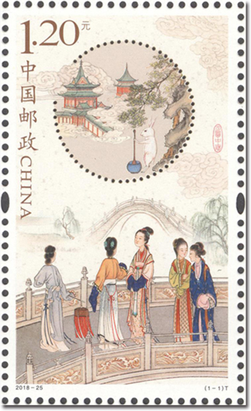 作为中秋祝福系列邮票的第二套,邮票延续2016年《月圆中秋》邮票传统工笔创作手法,画面上半部分展现《玉兔捣药》的神话传说,象征身体健康平安、多福多寿;下半部分描绘“中秋走月”的民间习俗,象征姻缘美满,添丁添福。