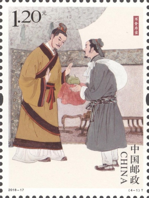 邮票选取中国古代从春秋时期到清代4个广为流传的古人居官正直,廉洁自律的故事。