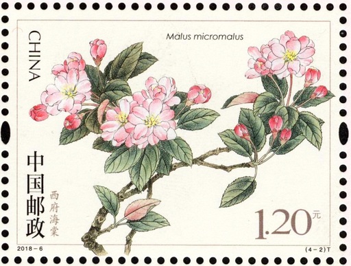本套邮票展现了楸子、西府海棠、河南海棠、三叶海棠四个品种。其中,西府海棠因曾得到周恩来总理的喜爱而闻名。2018年是周恩来同志120周年诞辰,本套邮票的发行也体现了对这位伟人的纪念。本套邮票采用传统的中国工笔画法,以花枝局部为中心,精谨细腻地描绘出唯美的画面效果,画面中既有肆意盛开的花朵,也有含苞未放的蓓蕾,花瓣、花丝、叶片,栩栩如生。画面整体背景为淡雅米色,突出了海棠花的素雅风骨。