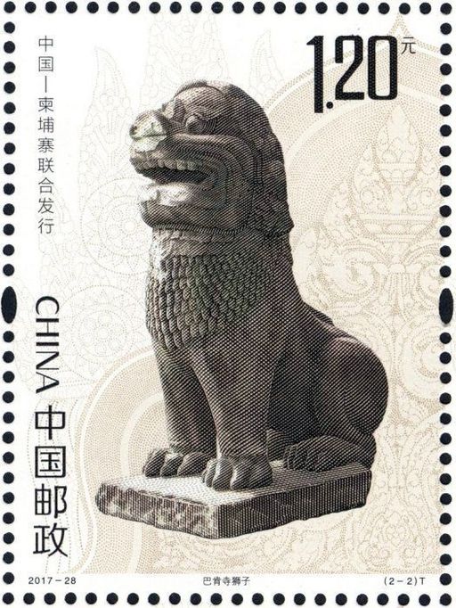 为增进中柬两国人民的相互了解和友谊,中国邮政和柬埔寨邮政决定联合发行《沧州铁狮子与巴肯寺狮子》特种邮票。邮票分别展现的是位于中国河北省沧州市沧县旧州镇的铁狮子和位于柬埔寨吴哥城南郊巴肯寺中的石狮子。沧州铁狮子高5.48米,重约40吨,背负莲花巨盆,昂首怒目,仰天长吼,距今已有1000多年的历史,是我国古代铁铸艺术中的一大珍品。狮子形象在柬埔寨也很受欢迎,常常出现在寺庙门或出入通道两侧。邮票上的石狮形象来自巴肯寺。巴肯寺是一座建于公元10世纪的印度教寺庙。寺庙呈金字塔形,台基五层,有石阶通往台顶,每层台基均有一对石狮守护左右。邮票上的石狮位于入口处。