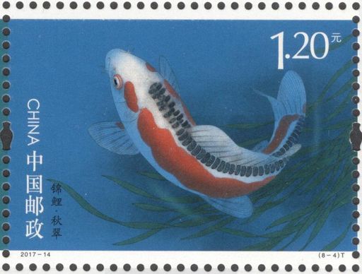 锦鲤,属鲤科,为鲤鱼的变种,经人工选育而成为一种名贵的观赏鱼类。它的游姿高雅,体形优美,鱼体呈现各种鲜艳似锦、变幻多姿的斑纹,观赏价值极高,素有“水中瑰宝”之美誉。鲤鱼在中国传统文化中具有大吉大利、年年有余、多子多福等多重吉祥寓意。目前锦鲤主要分为13类100多个品种,此套邮票选取的8个品种均为在国际锦鲤大赛上获得过冠军的品种。