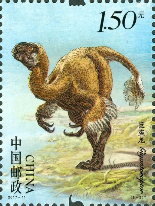 从1951年开始,古生物题材开始陆续出现在许多国家和地区的邮票上,其中尤以爬行动物,特别是恐龙题材邮票最受青睐。我国在1958年发行的特22《中国古生物》邮票中,出现过禄丰龙骨架和复原图的画面,这是世界上第一枚印有恐龙形象的邮票。此次《中国恐龙》特种邮票则是中国邮政首次发行以恐龙为主题的邮票。该套邮票以在我国境内发掘的恐龙化石复原图为主要内容,整体画面富有动感,兼具科学性和艺术性。套票版张以外形特征较明显的永川龙和华阳龙作为画面的视觉中心,将生活在中生代的恐龙由中心向四周做环状排布,套票版张边饰还描绘了其他几种不同类型的恐龙形象和当时的生态环境;小型张以马门溪龙为主体,边饰表现了沱江龙的形象,描绘了侏罗纪时期地球的生态环境。