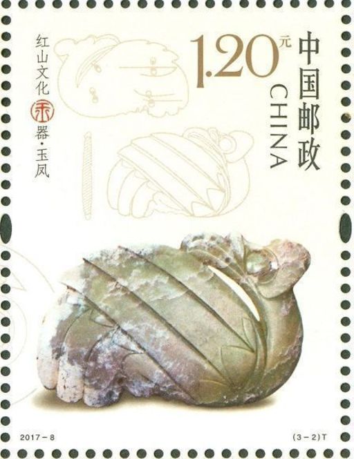 红山文化是中国东北部地区最重要的新石器时代考古学文化,因内蒙古赤峰市红山后遗址的发掘而得名,主要分布于内蒙古东南部、辽宁西部及河北北部,距今约6500-5000年。红山文化玉器种类多样,以玉龙、玉凤和玉人等为代表。邮票上的玉龙出土于内蒙古敖汉旗下洼镇,龙首大眼圆凸、大耳直立,卷曲如玦环状,是红山文化中发现较多的典型玉器。邮票上的玉人和玉凤均出土于辽宁牛河梁遗址。其中,玉凤曲颈回首,羽翅层次分明,线条优美流畅;玉人雕琢了一位神灵附体、正在通神行法的巫者形象。