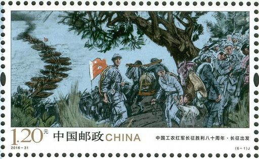 该套邮票由著名画家沈尧伊先生设计,作者以他对长征特别的情愫和浪漫主义的表现手法,展现了80年前中国工农红军长征的伟大壮举。邮票图稿设计写实和写意相结合,前景人物写实,使观者对历史场景产生直观感受;背景的房屋、高山、树木以及天空则为写意。整个设计主体突出,形象生动,准确表达了该套邮票的主题。