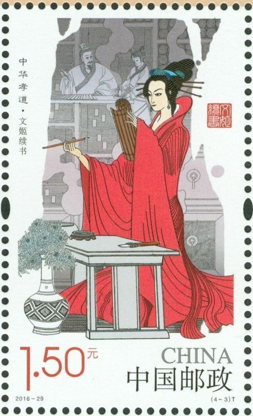 我国孝道文化包括敬养父母、生育后代、推恩及人、忠孝两全、缅怀先祖、继承遗志等。《中华孝道(二)》邮票,选择二十四孝之外的“文姬续书”上邮票,确实慧眼独具。这和2014年发行《中华孝道(一)》邮票,选择的花木兰“替父从军”、孙思邈“学医疗亲”一样,扩展延伸了中国孝道文化的范围与内涵,突出了一种大孝,可以说是忠孝两全,把孝敬父母与感恩国家,服务人民紧密联系了起来,形成了一个由个体到整体,修身、齐家、治国、平天下的延展攀高的多元文化体系。