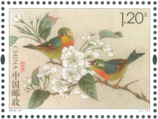 邮票画面采用中国画工笔重彩的表现形式,一对相思鸟在梨花间,暗含“成双成对不离不弃”之意。