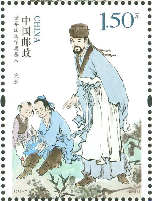 该枚邮票由著名画家范曾设计,用中国画的形式表现,线条遒劲有力,设色高古典雅,充分表现了宋慈作为世界法医学奠基人的精神和气质。该套邮票采用胶雕套印工艺,雕刻者为白金、刘益民,河南省邮电印刷厂印制。
