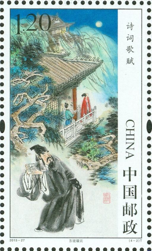 该套邮票由当代中国著名画家冯远设计,第一图表现了杜甫《春夜喜雨》的场景,诗人于画面前方,背景为春夜喜雨的诗意情景境,诗境与画境浑然一体。第二图表现了苏轼《水调歌头·明月几时有》的场景,画面中作者手执酒杯,仿佛在闭目思念自己的亲人。第三图表现的是白居易《长恨歌》的场景,画面中白居易正赋歌哀叹明皇与玉环的爱情悲剧,背景为唐明皇和杨玉环同游的场景。第四图表现了曹植《洛神赋》的场景,曹植若有所思,洛神容仪服饰华美,乘车而来,飘逸脱尘。
